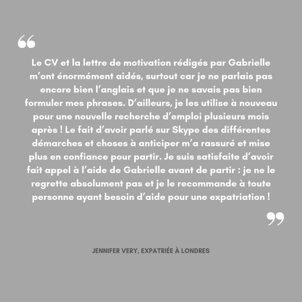 Besoin d’aide pour votre expatriation ou envie de trouver votre voie ? Je vous propose des séances d’aide à l’expatriation ou au changement de voie professionnelle par Skype ou par téléphone. Très souvent, une seule séance suffit à éclairer votre situation, et j’ai d’ailleurs conçu mes séances de cette manière : vous apporter un maximum de clés en une seule discussion. Mais pour ceux qui souhaitent continuer à travailler avec moi après le premier appel, je propose un tarif dégressif. Vous avez besoin de mon aide mais ces services ne s’adaptent pas à votre situation ? Contactez-moi à l’adresse gabrielle@lalleedumonde.com pour en discuter. Pour savoir si une séance avec moi pourrait vous aider, faites-vous une idée en lisant les témoignages en bas de page !